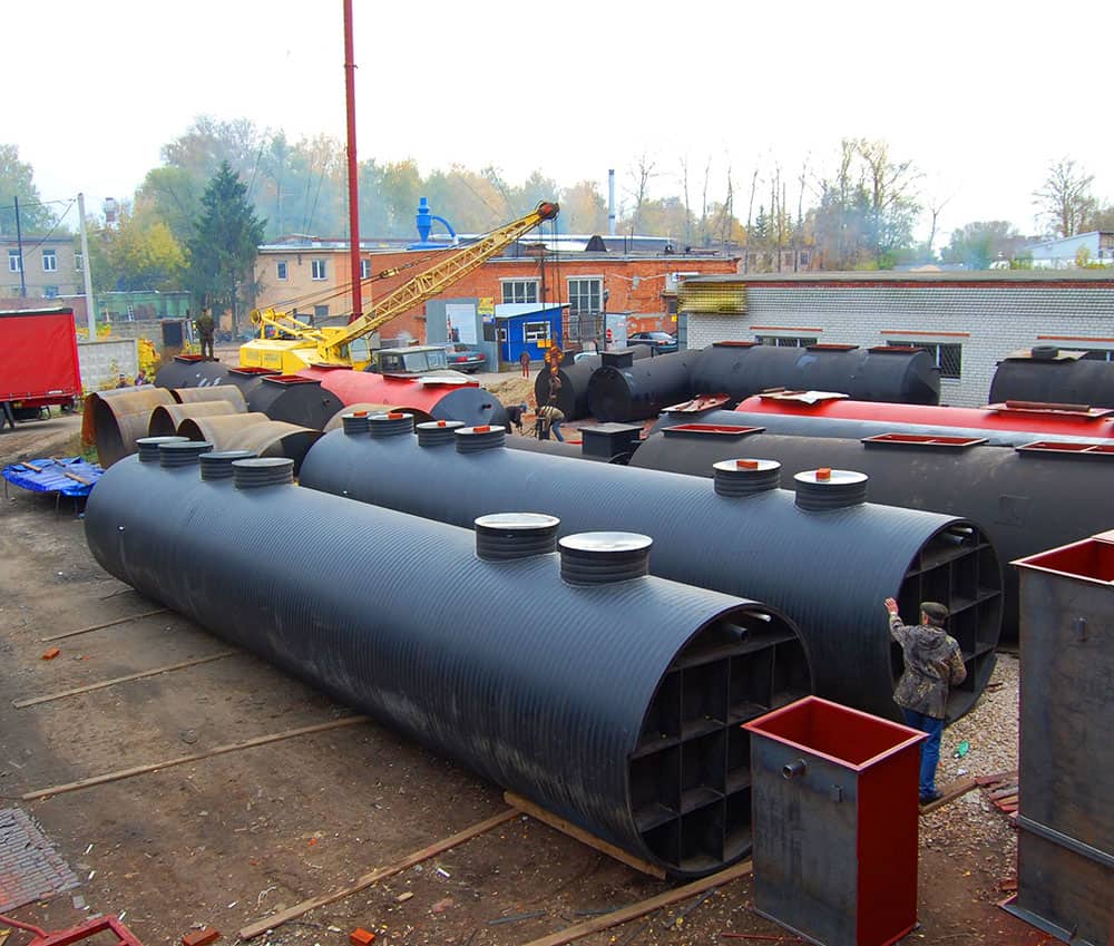 - Корпус изготовлен из низколегированной стали с многослойным антикоррозийным покрытием. Возможно изготовление из спирально-витого ПНД или стеклопластика.